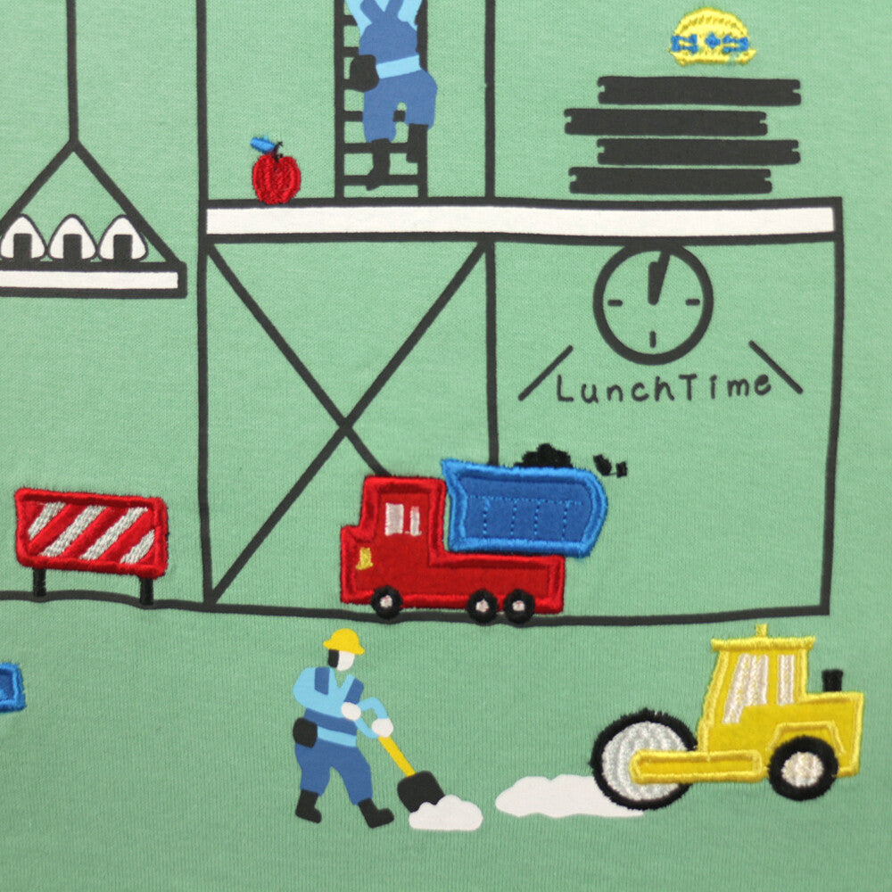 This is an appliqué long sleeve T-shirt from the brand "BAB CHIP" that uses plenty of appliqués of boys' favorite trains and vehicles. A humorous design depicting a construction site during lunch time. The car suspended from the crane can also be stored in your pocket! There is a patch on the back of the appliqué so it won't irritate. Made of 100% cotton, even children with sensitive skin can wear it with confidence. Comes with a name tag to put your name on.