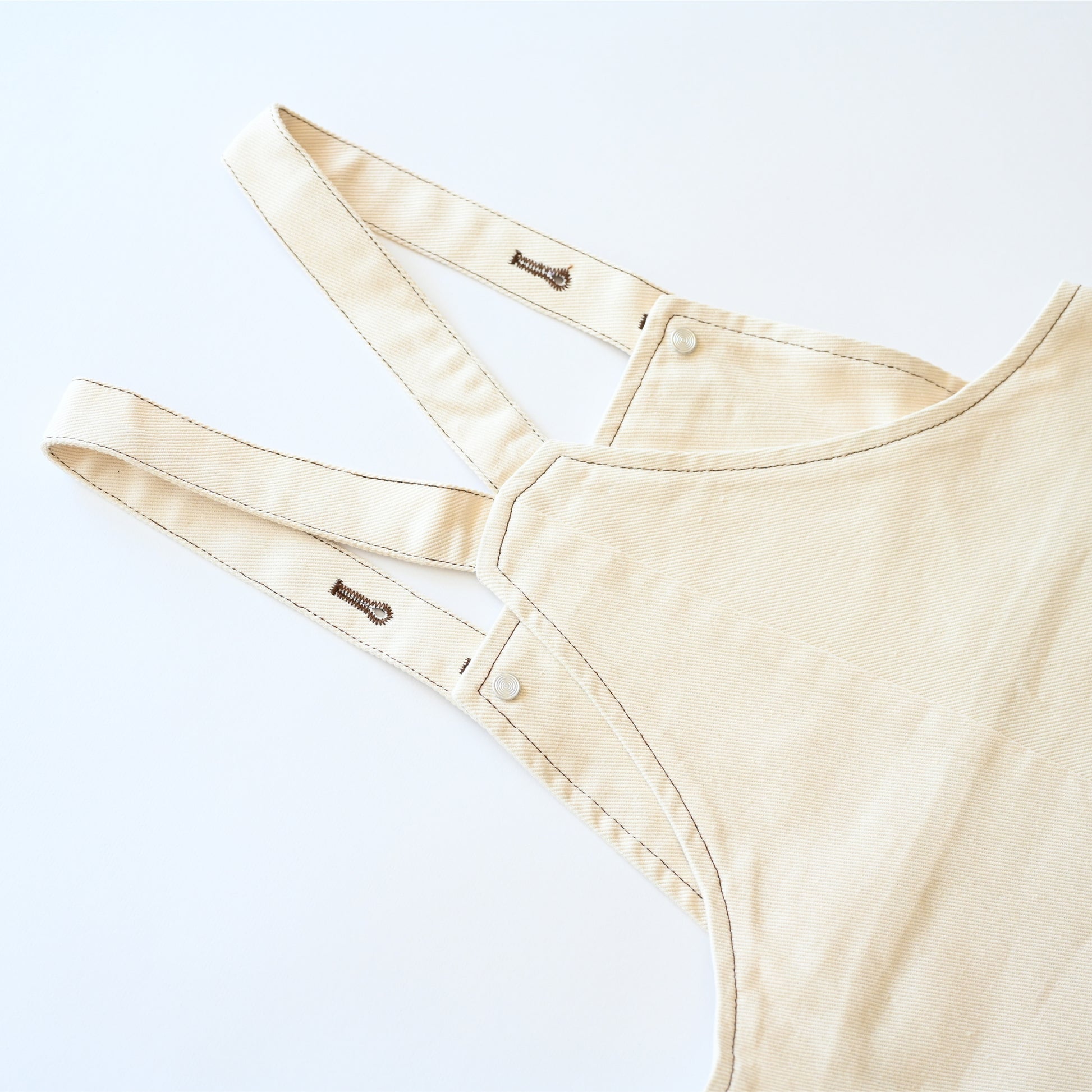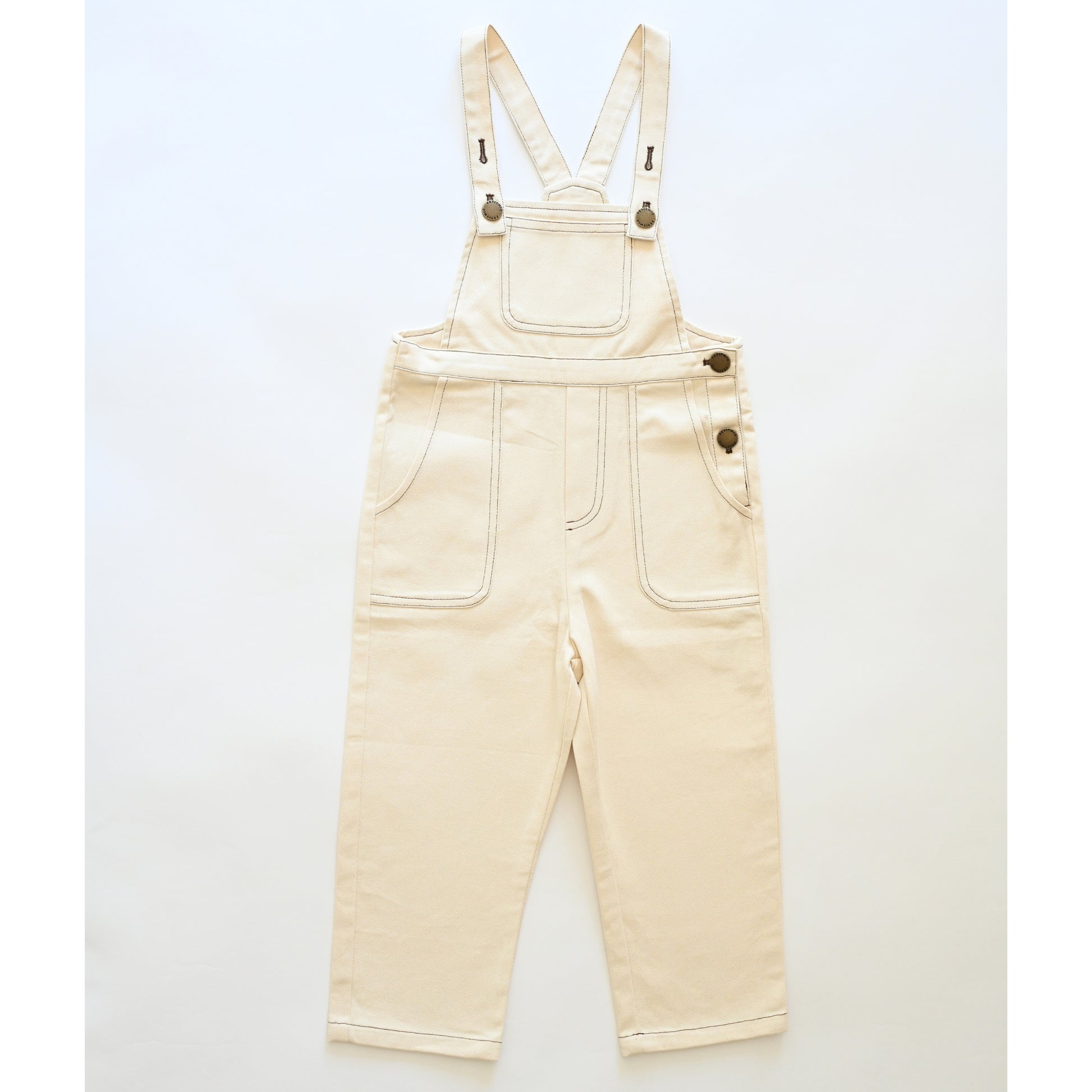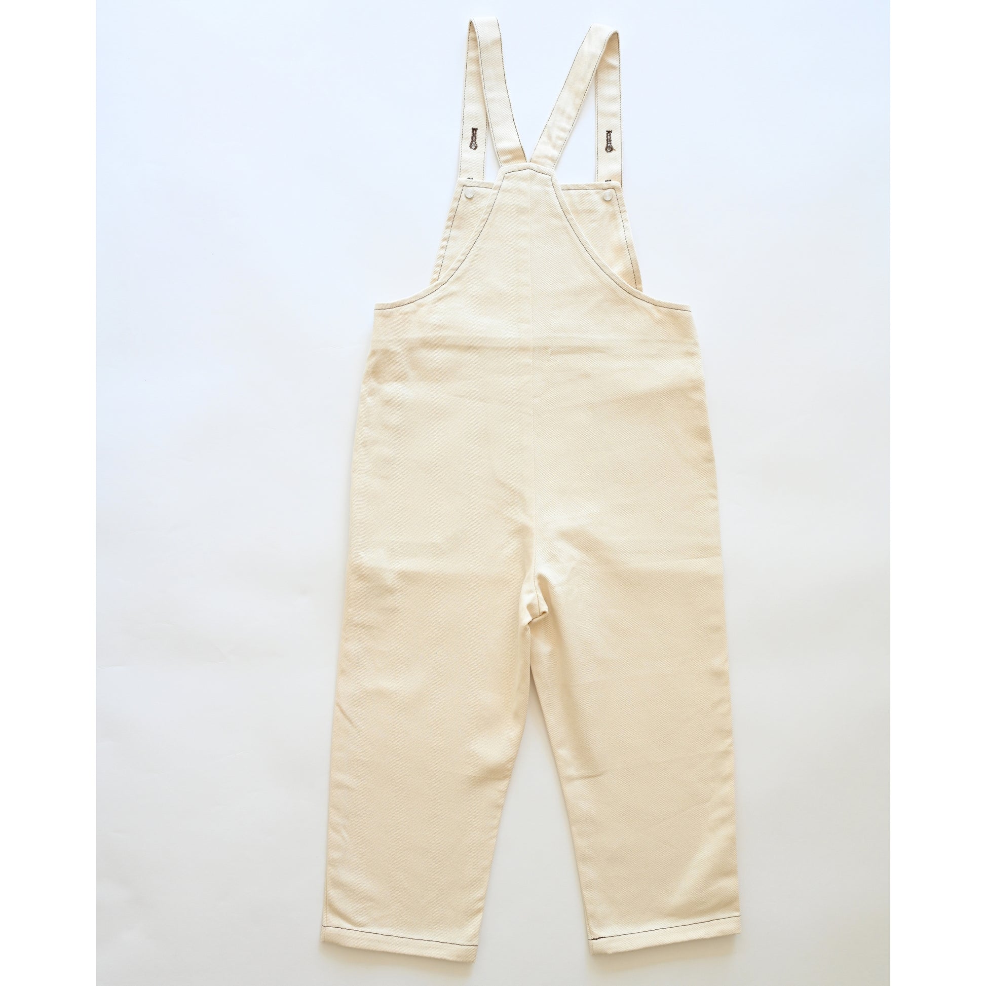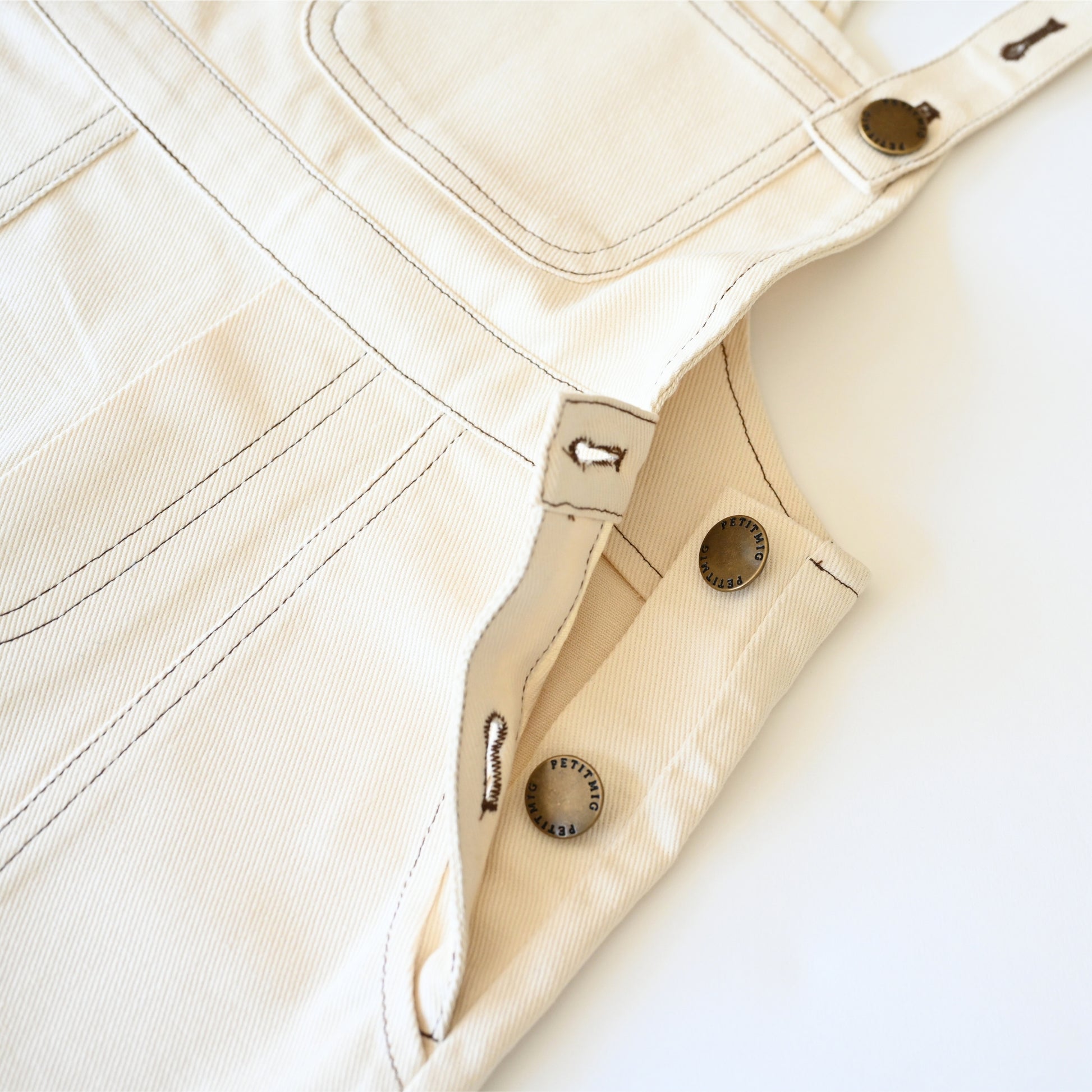 丈夫なオフホワイトのデニム生地を使用したサロペット。