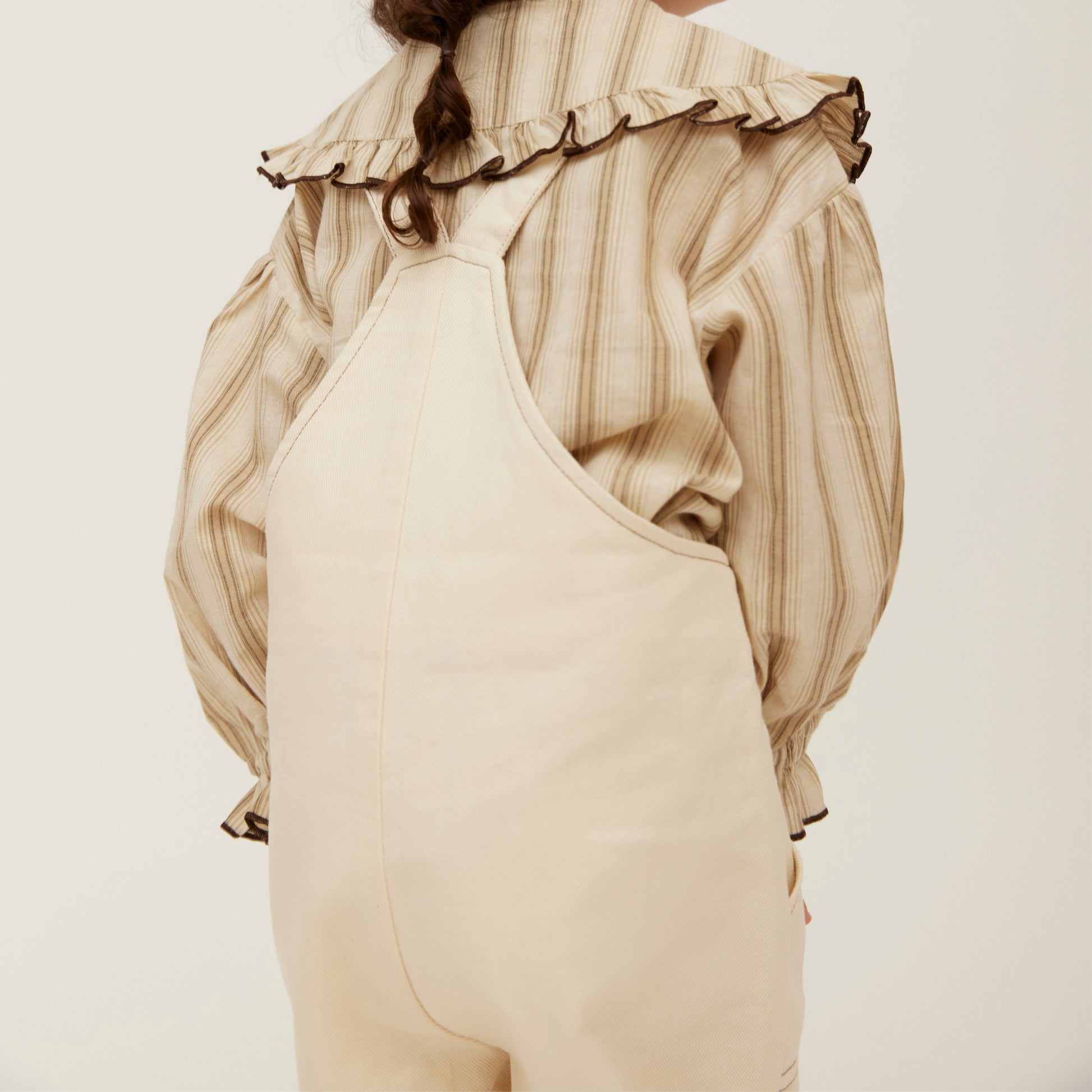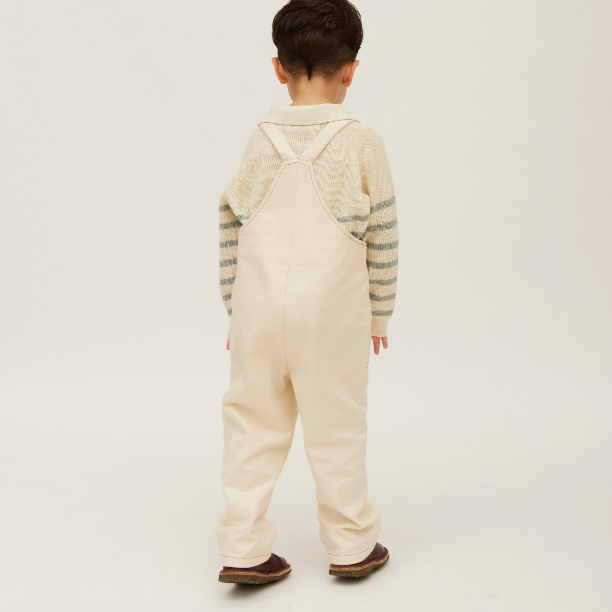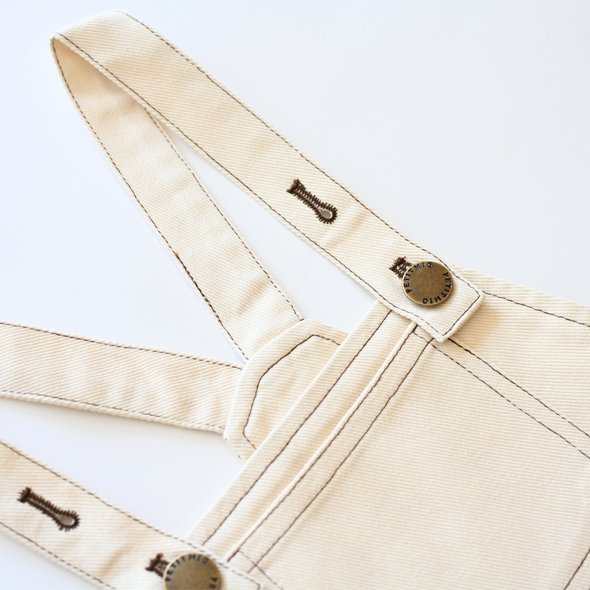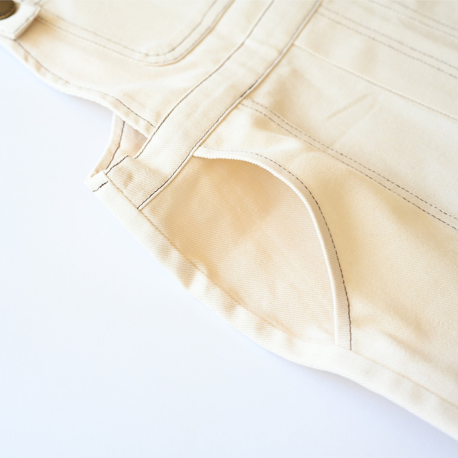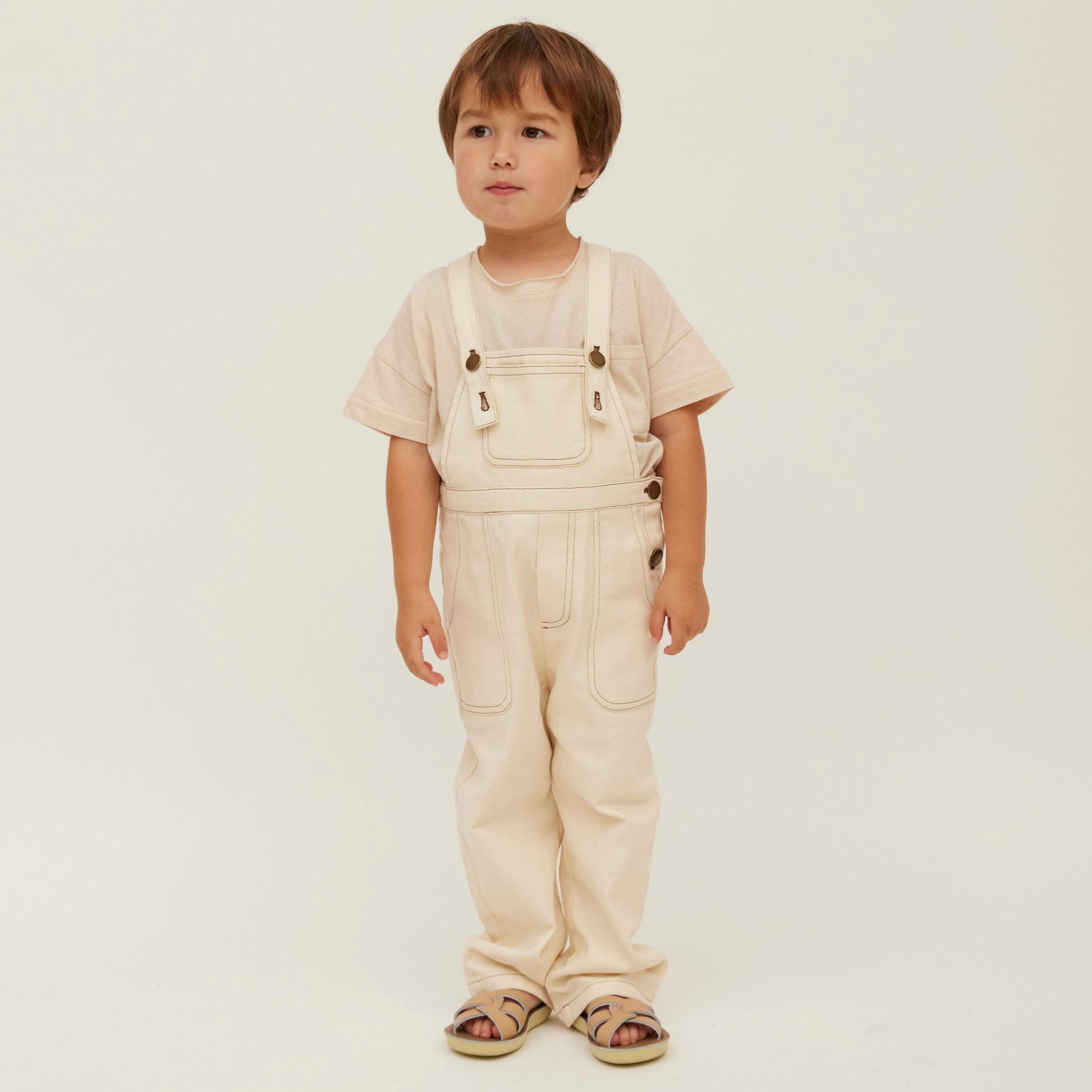 丈夫なオフホワイトのデニム生地を使用したサロペット。