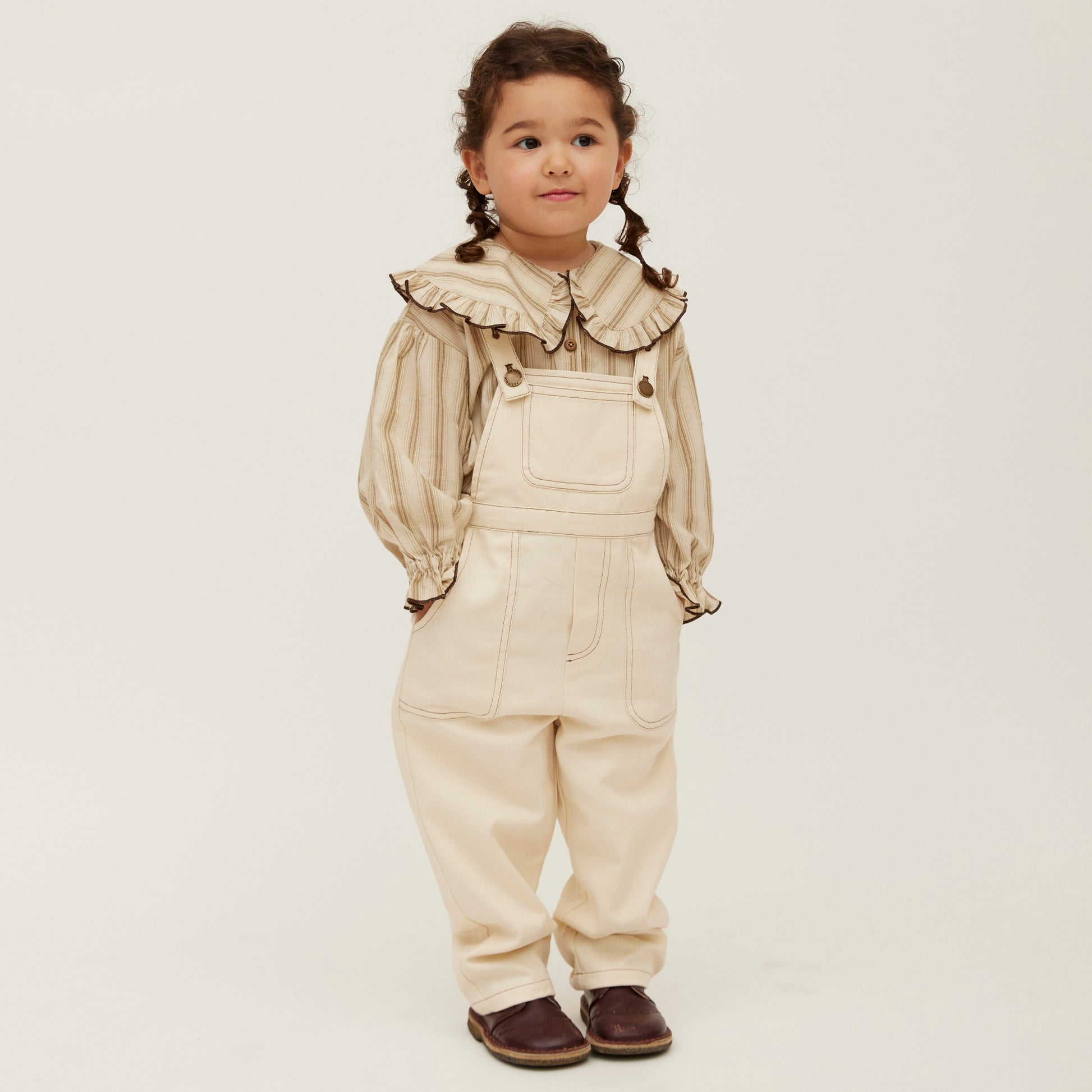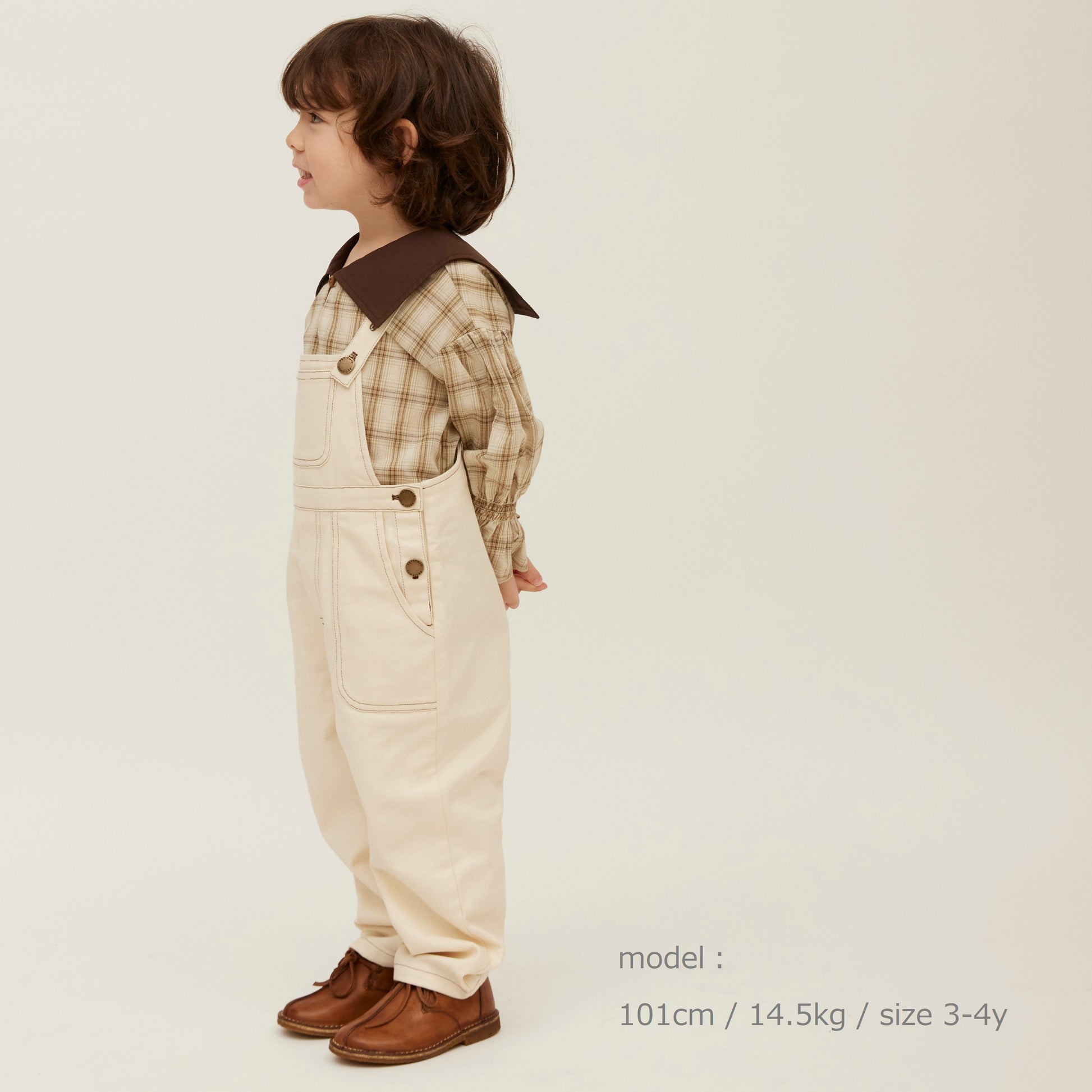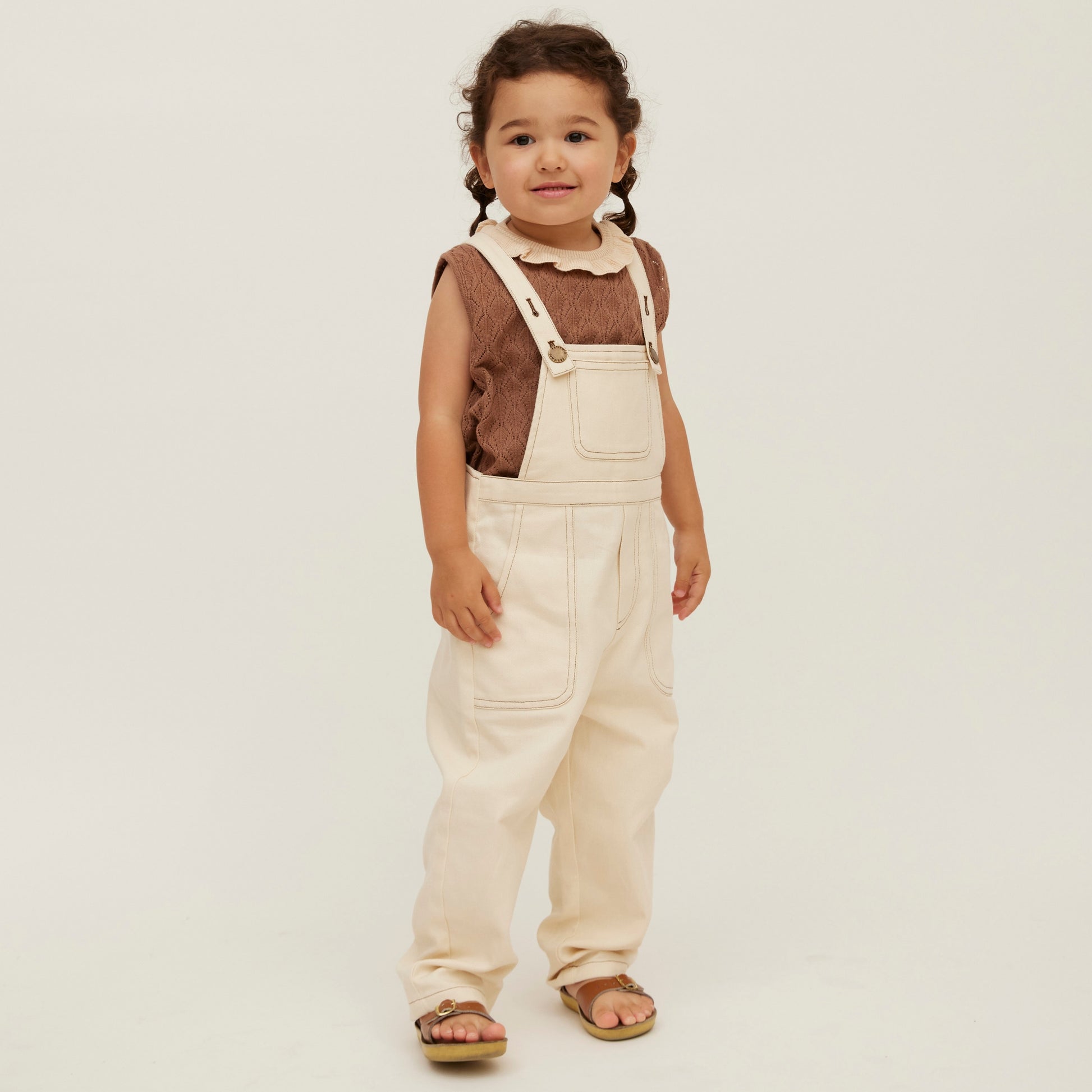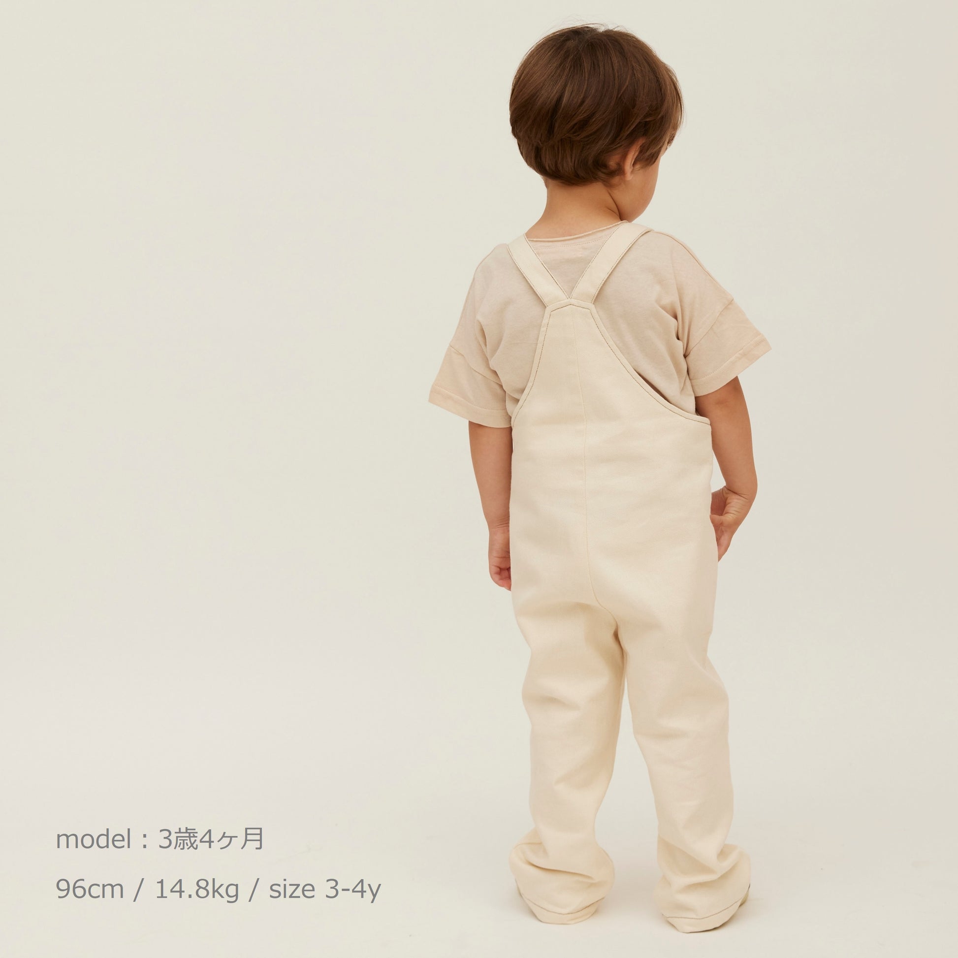 丈夫なオフホワイトのデニム生地を使用したサロペット。