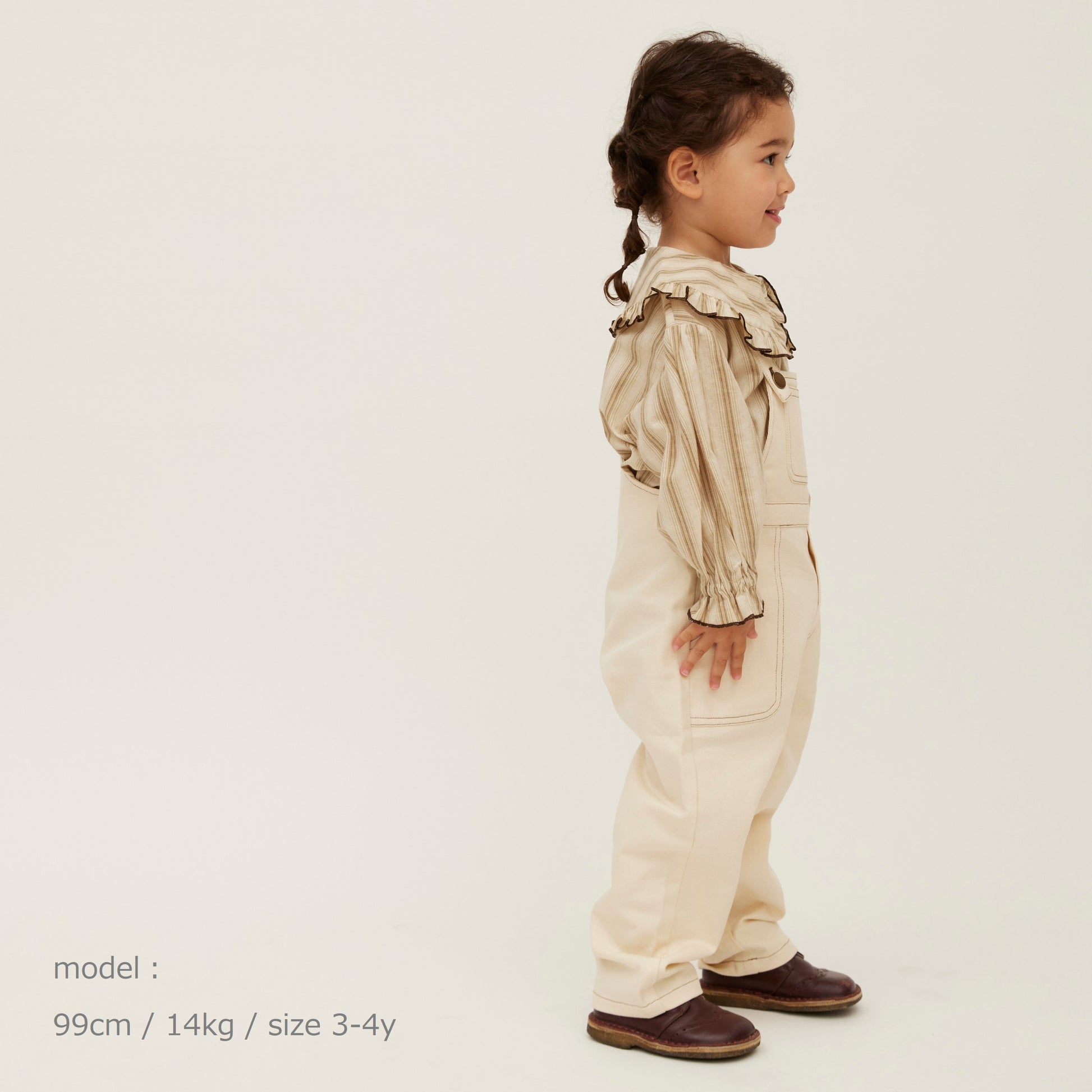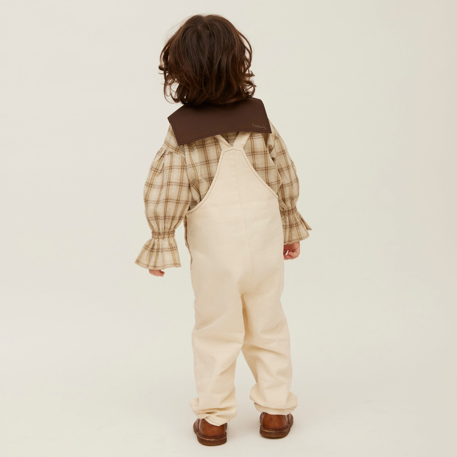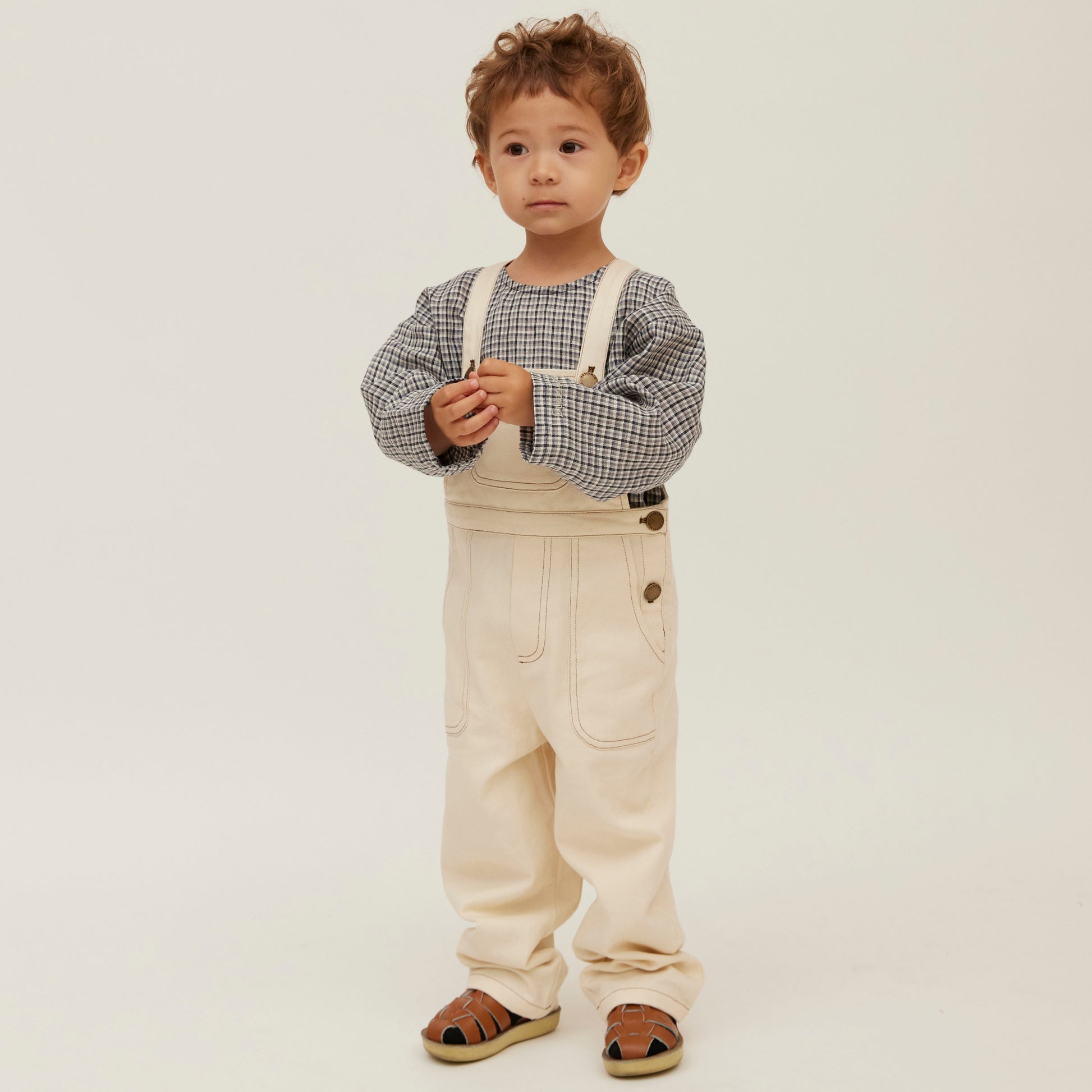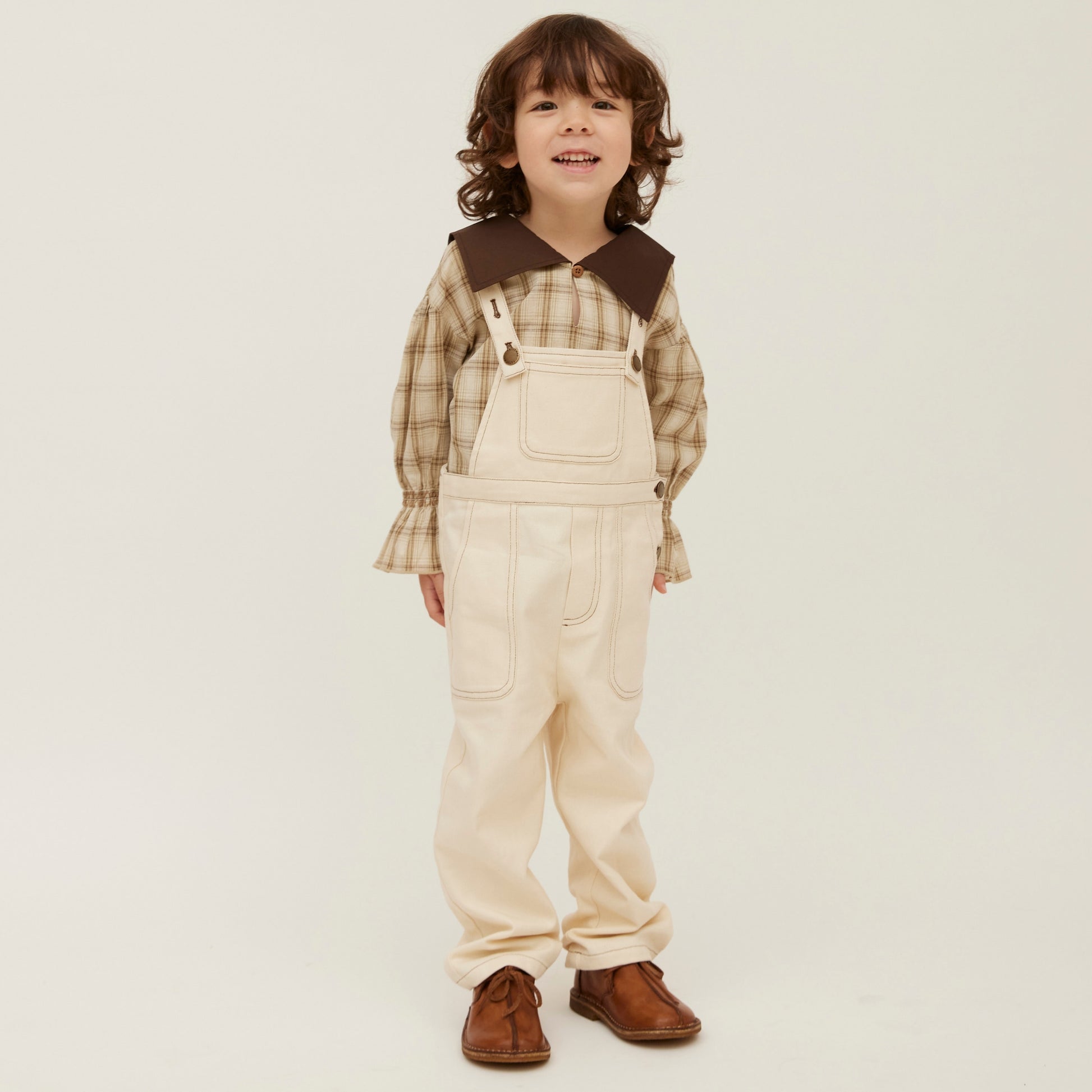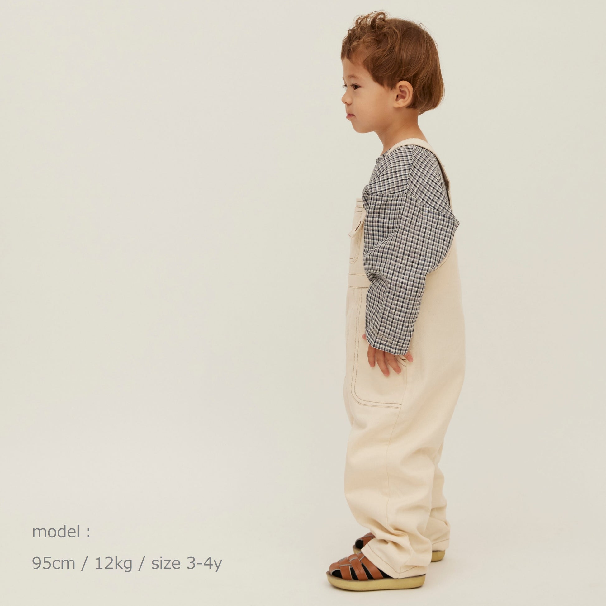 丈夫なオフホワイトのデニム生地を使用したサロペット。