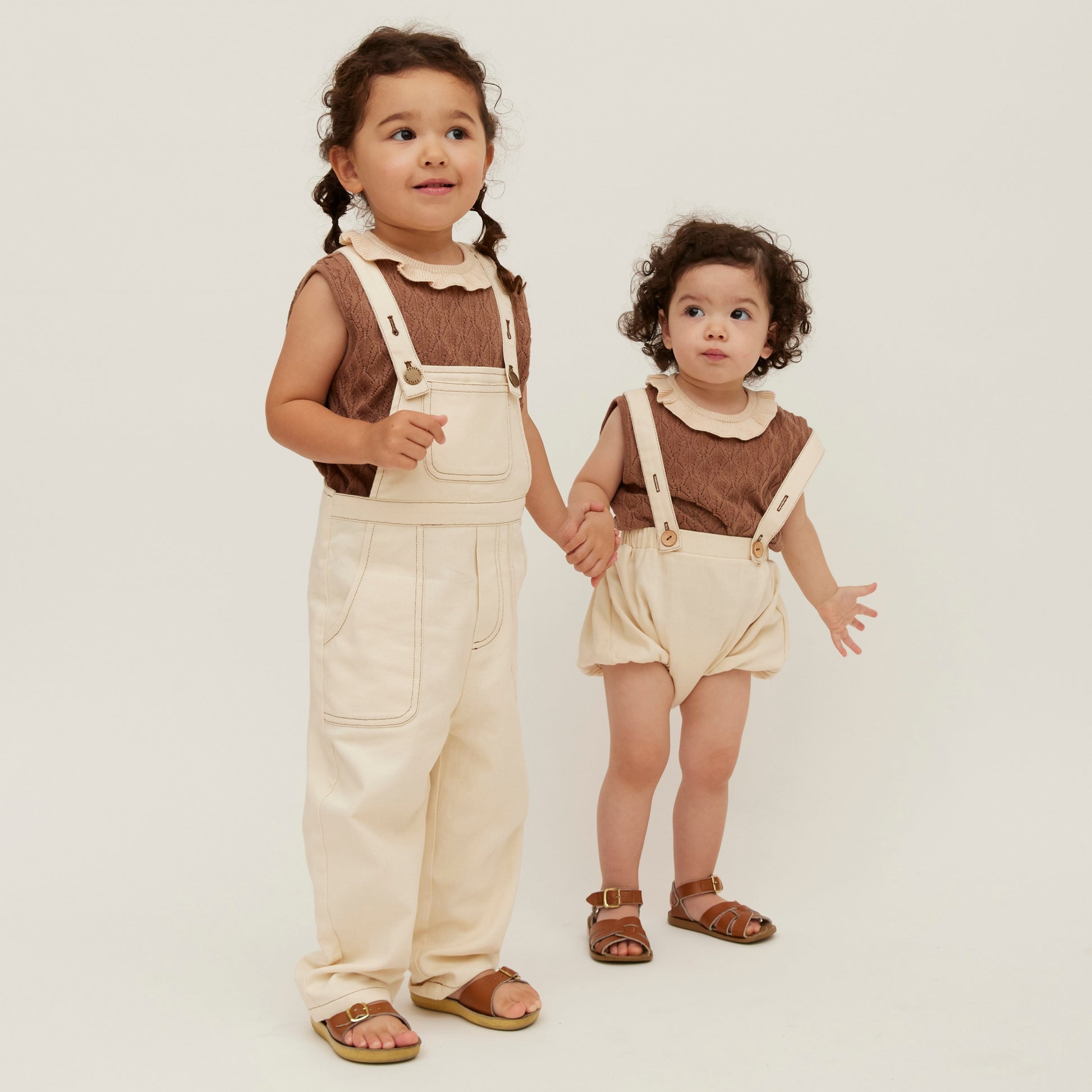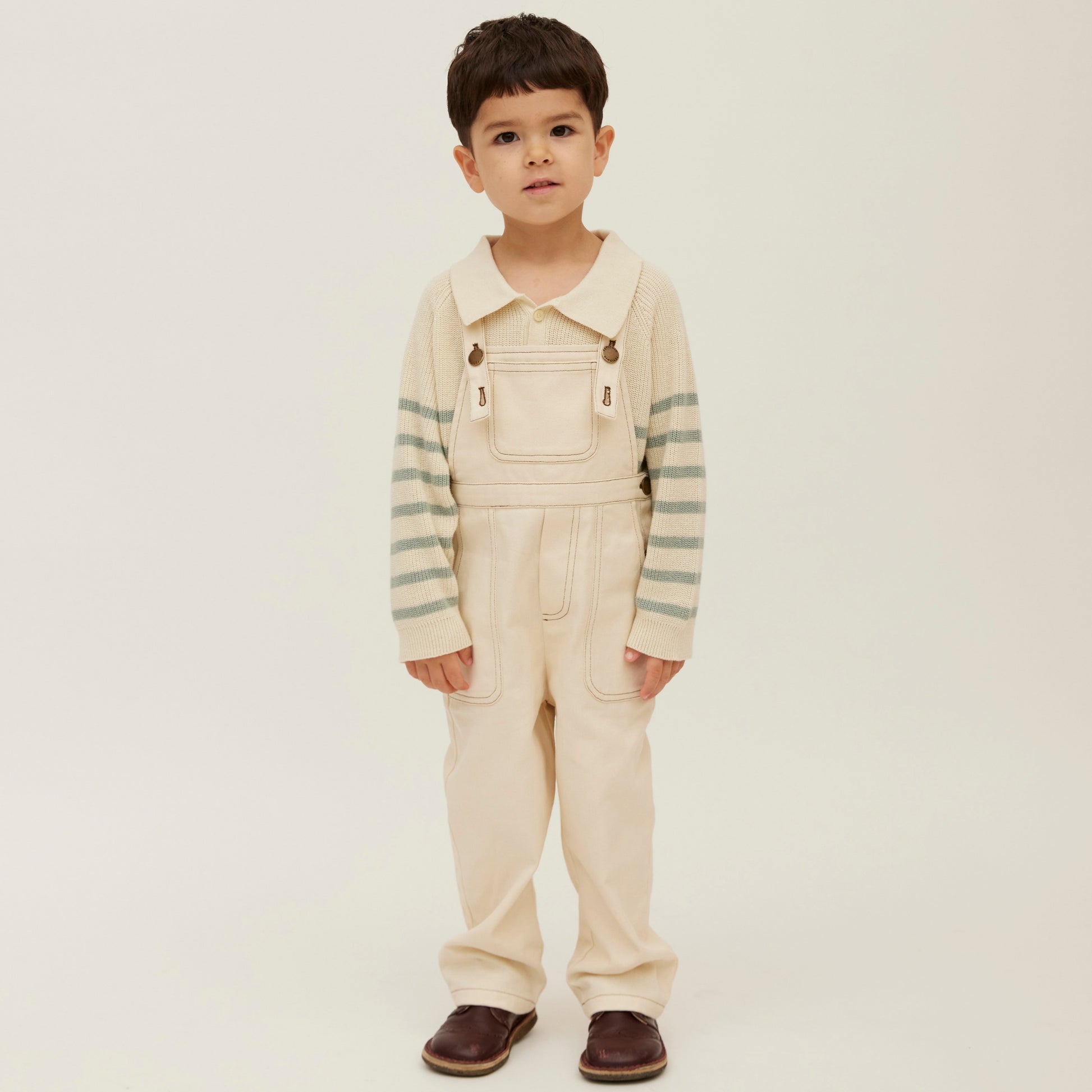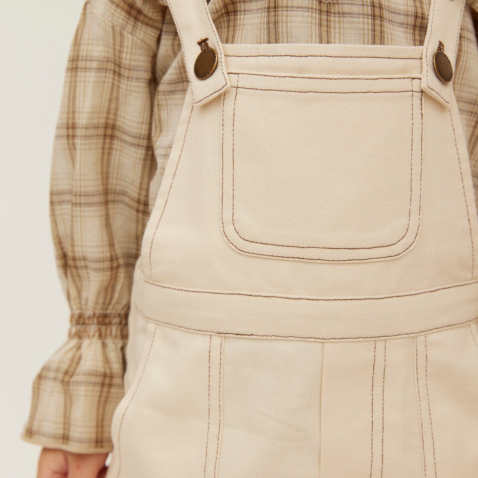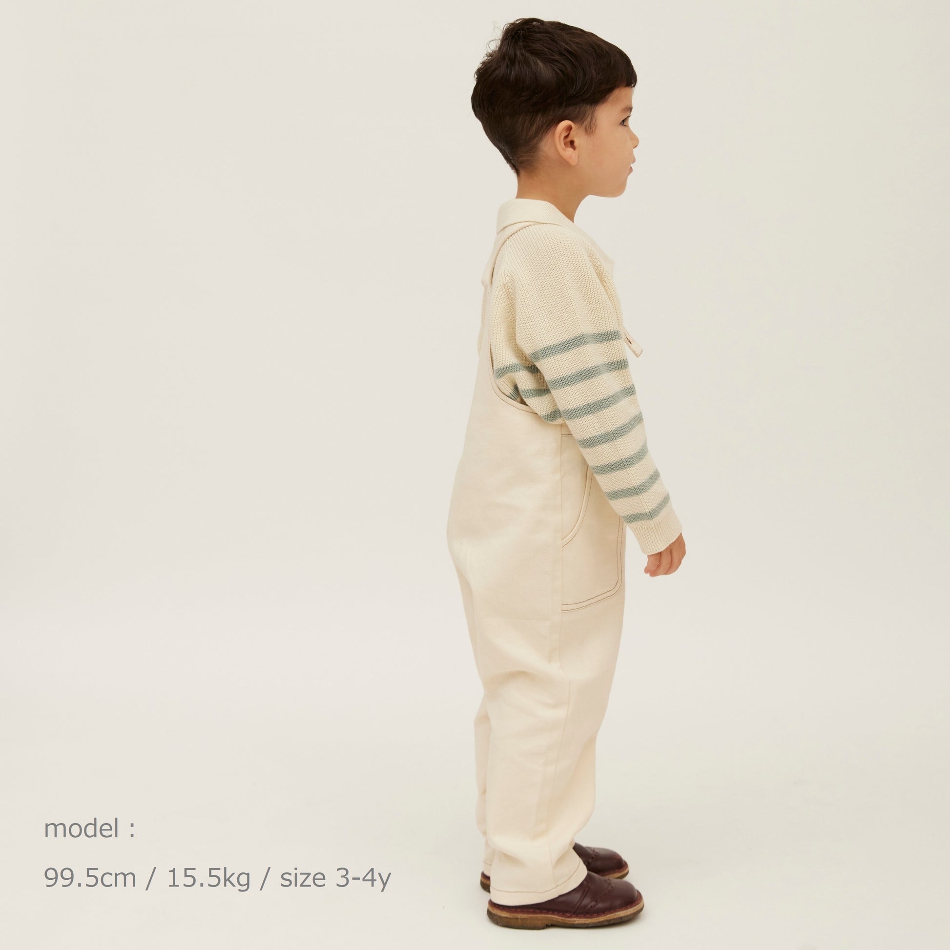 丈夫なオフホワイトのデニム生地を使用したサロペット。