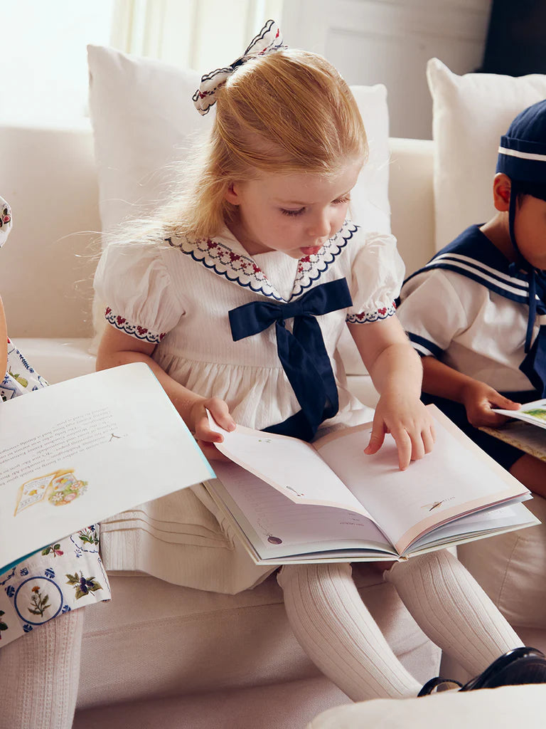 人気の高いアストリアドレスは、柔らかなホワイトコットン素材にセーラーカラーのディテールを施したデザインです。ネイビーの大きなリボンとスカロップ刺繍が特徴的な洗練されたドレスは、特別な日や秋の装いにぴったりです。