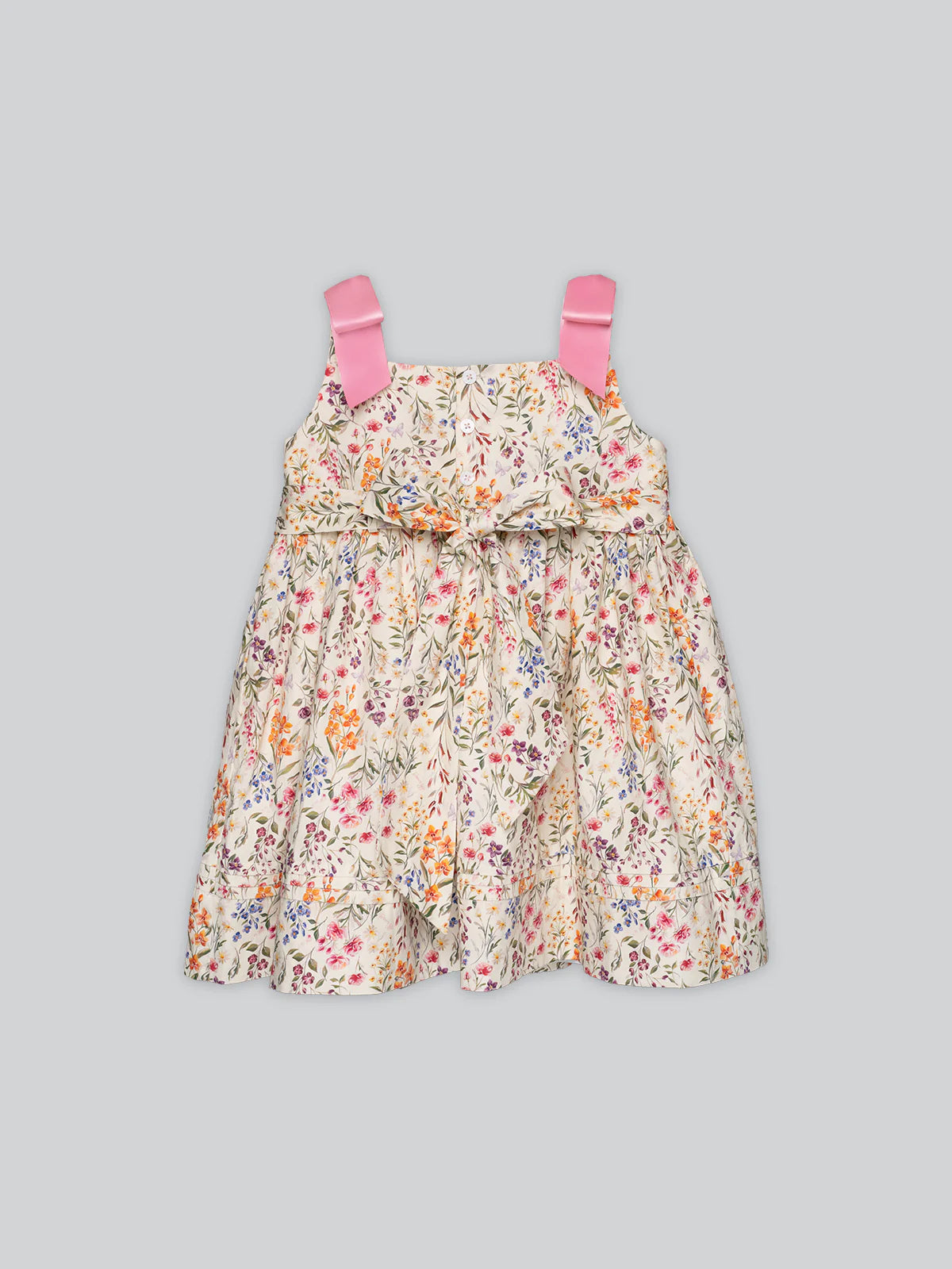 タイムレスなノースリーブドレス「Foliage」は、Dear GG特製ファブリックを使用しています。手作業によるスモックディテール、肩にあしらわれたピンクのサテンディテール、そして総裏地仕上げが特徴的なこのドレスは、子供時代の無邪気さを体現しています。