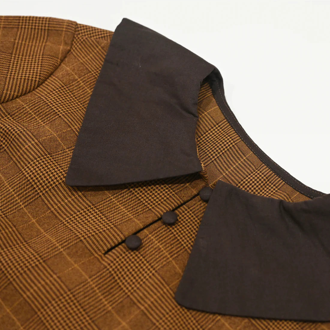 シワになりにくい生地を使用し、くるみボタンや襟の切り替えデザインで上品さを演出。