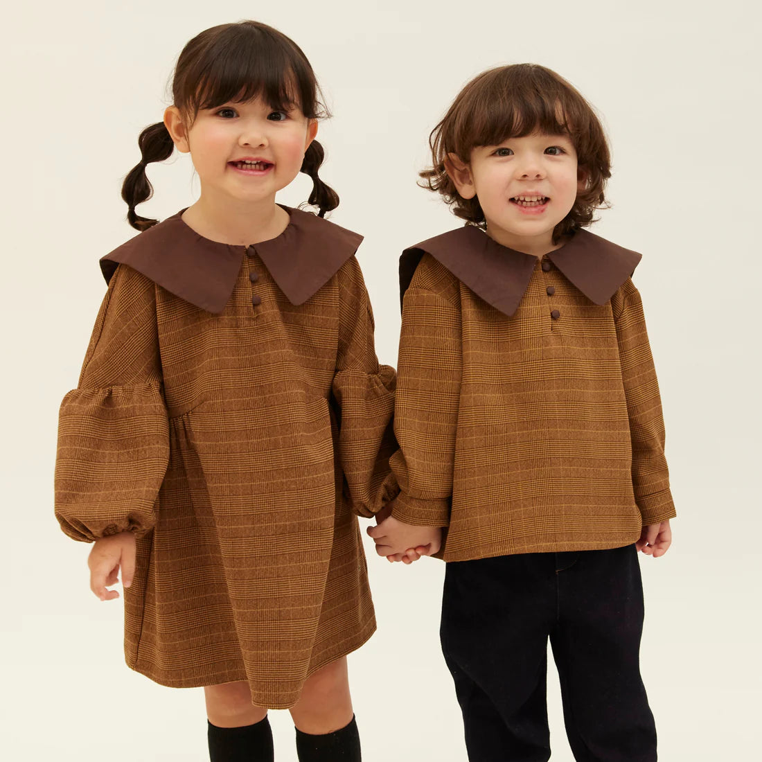 兄弟姉妹お揃いで楽しめる、高級感あふれるグレンチェック柄のシャツとワンピースが登場。