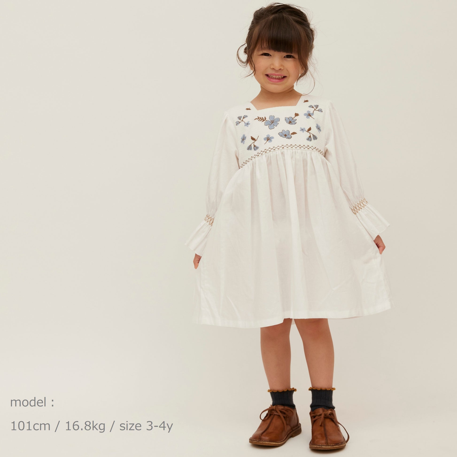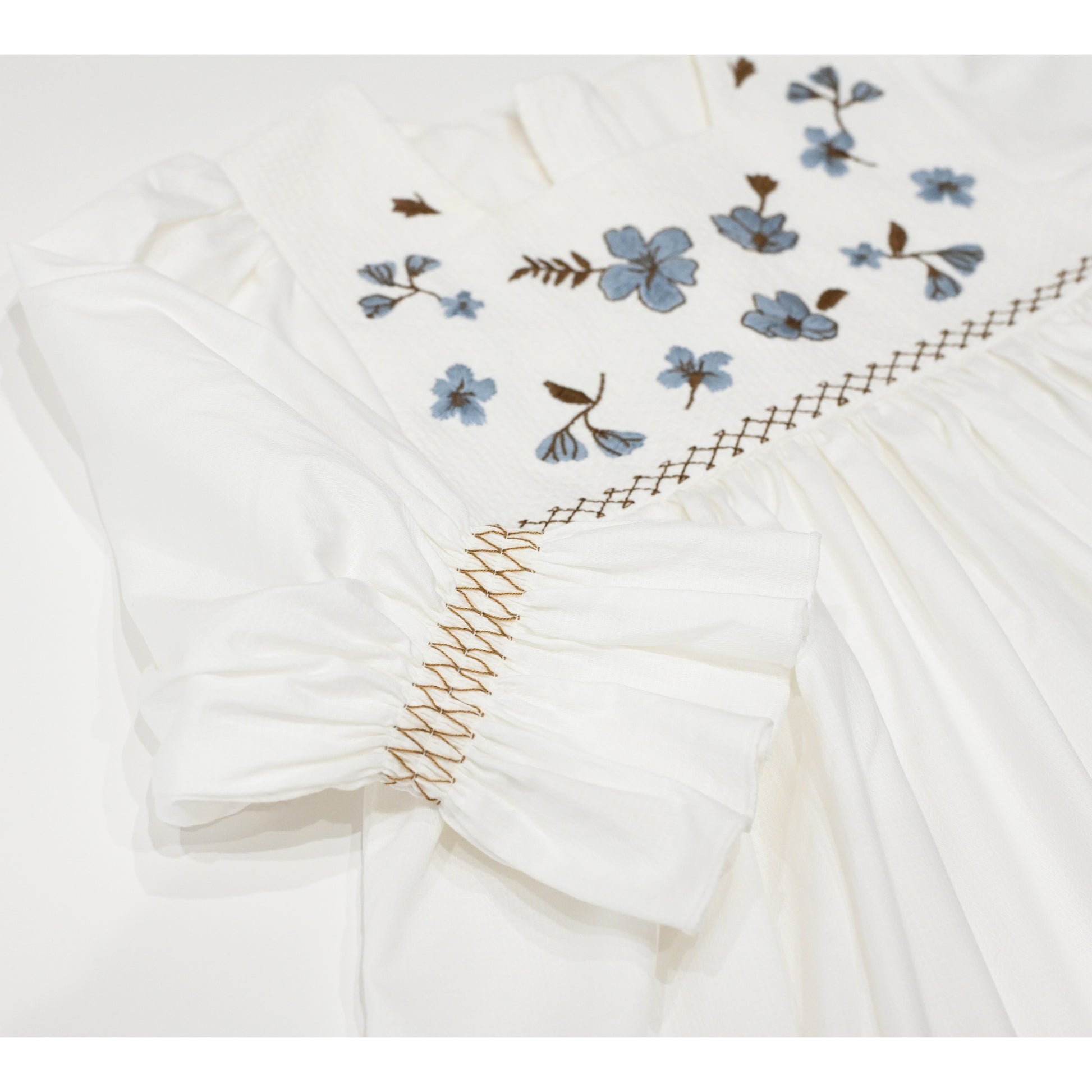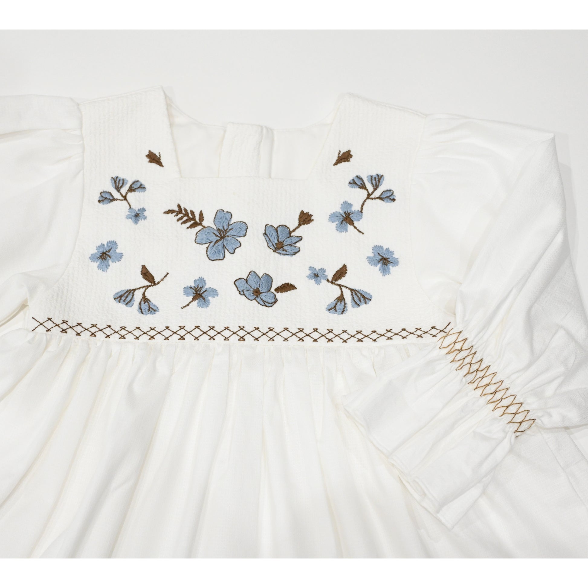 PETITMIG初となるデザインで、胸元には大胆にブルーの花とブラウン系の葉っぱを刺繍しました。