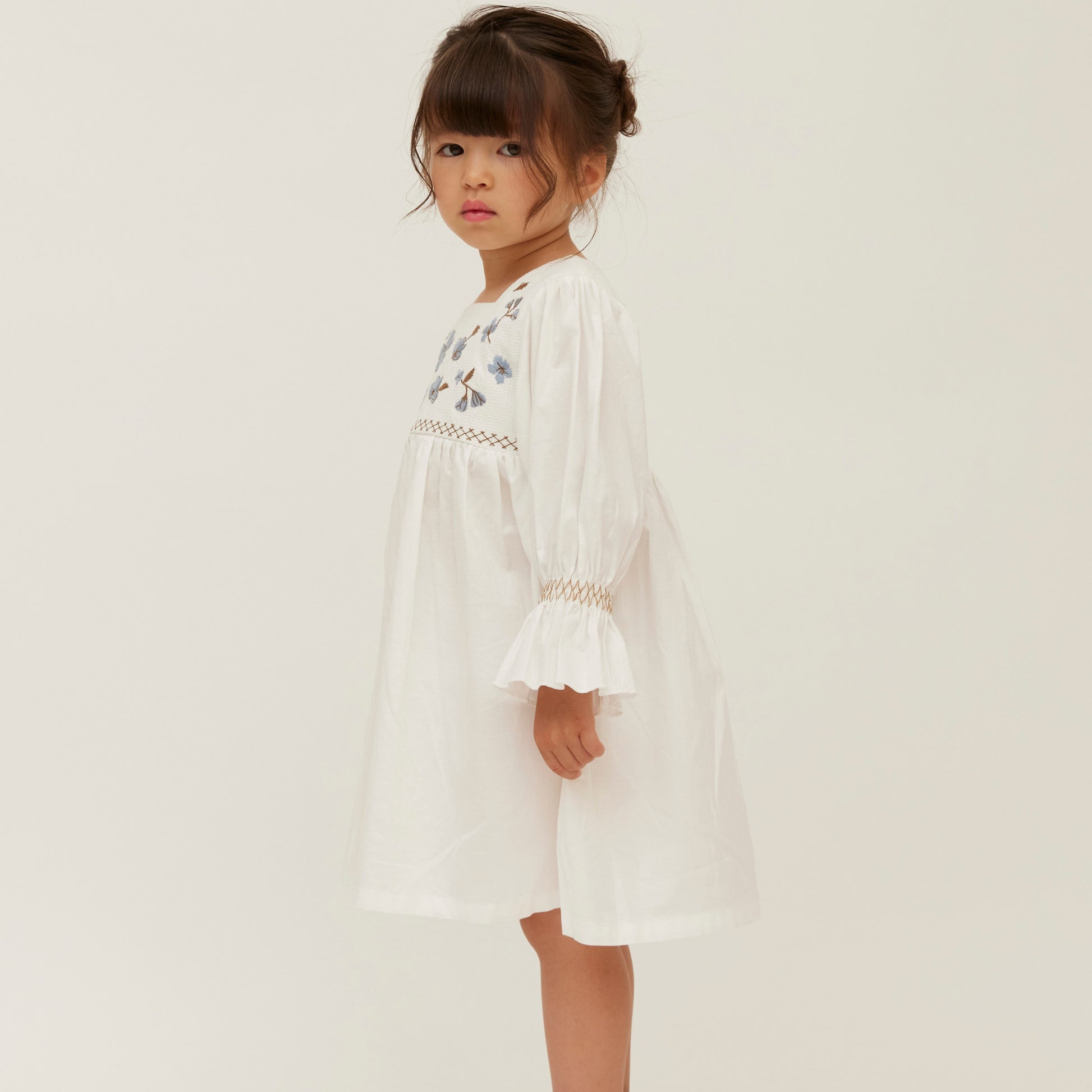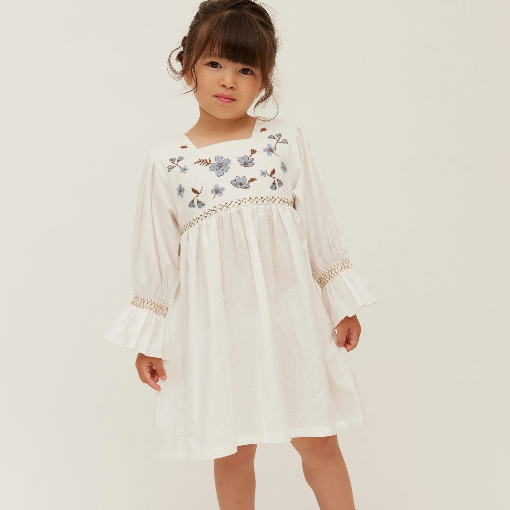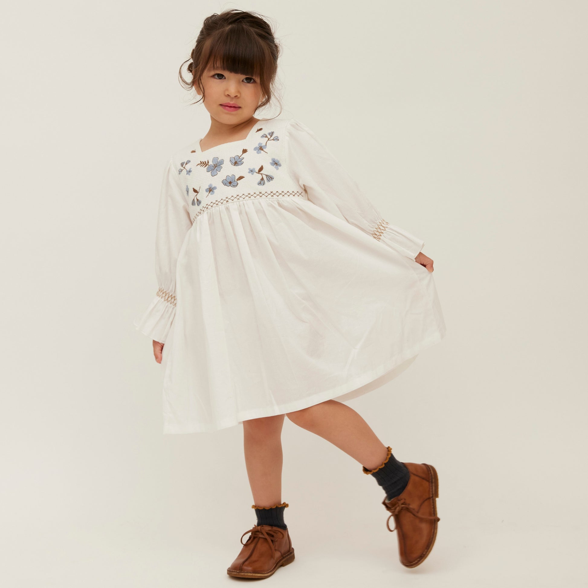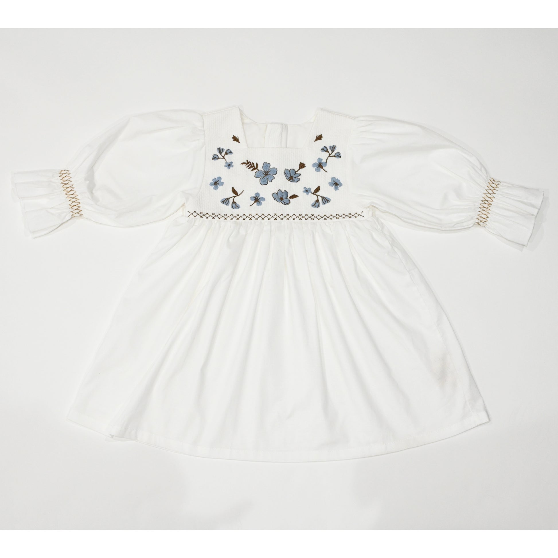 PETITMIG初となるデザインで、胸元には大胆にブルーの花とブラウン系の葉っぱを刺繍しました。